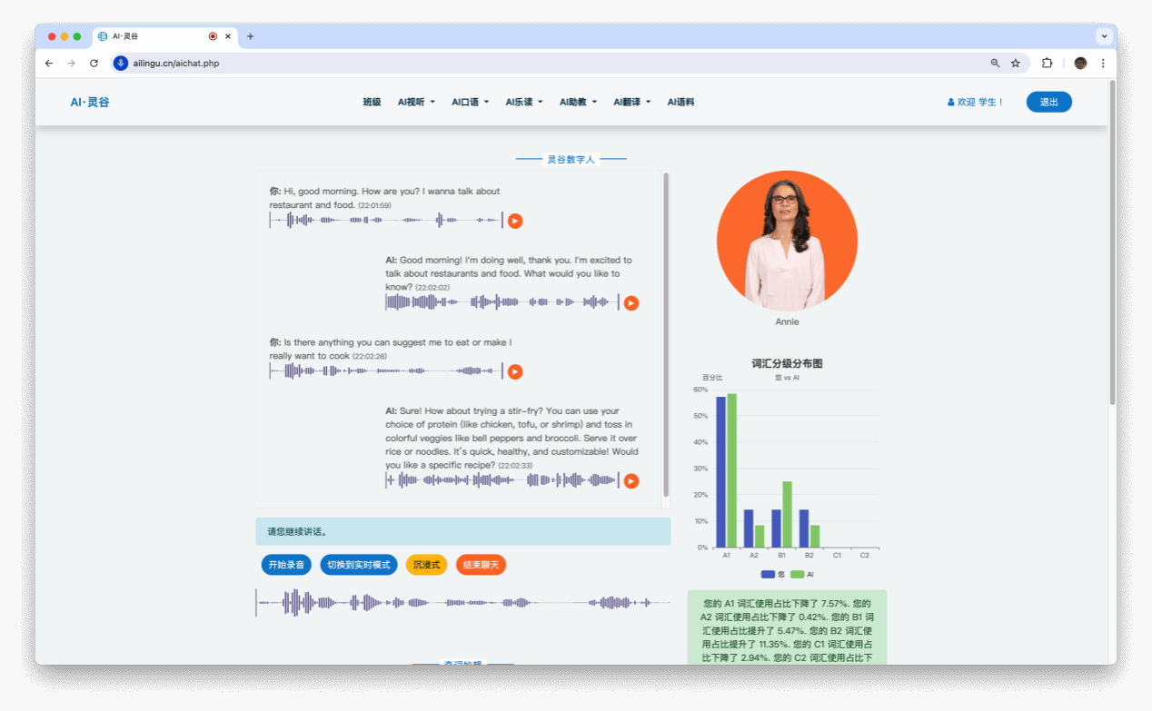 此外,学院积极拥抱“人工智能+”,自主研发的智能外语学习平台依托前沿大语言模型技术,通过云服务架构,整合大语言模型、AI合成语音、数据分析等技术,以AI互动训练等智能辅助工具的形式,为本科及以上学生提供智能交互式学习环境,提供个性化的 “五位一体”(听、说、读、写、译)学习解决方案。