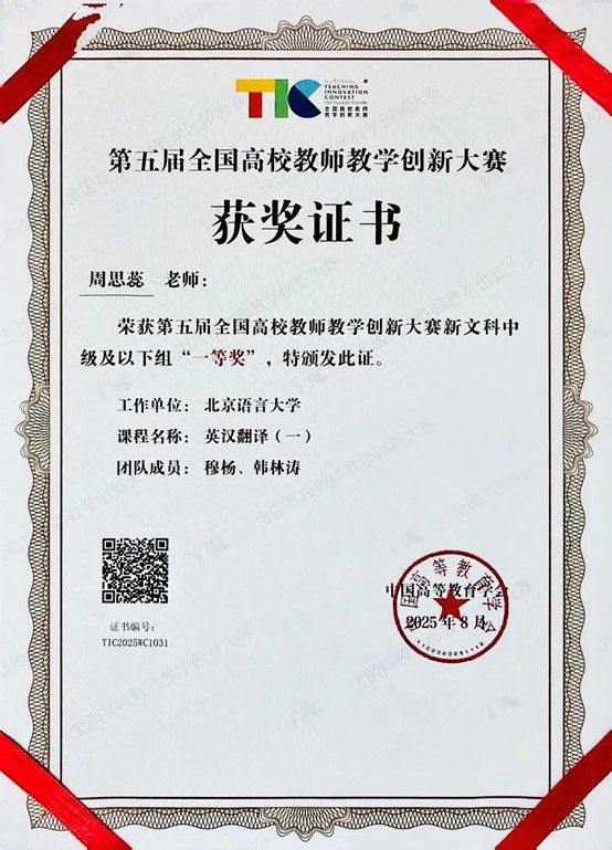 在被誉为教师教学“奥林匹克”的第五届全国高校教师教学创新大赛中,周思蕊老师团队凭借《英汉翻译(一)》课程,从全国12.7万名参赛教师中脱颖而出,斩获北京市赛一等奖和全国赛一等奖,实现了我校在该项赛事中的历史性突破。该课程紧扣“推动教学创新,培养一流人才”的大赛主题,以“多语复合、文化互鉴”“中外共译、数智融合”“知行并重、需求驱动”为改革思路,靶向解决了传统翻译教学中人机协同不足、跨文化认知薄弱等痛点问题,是学院深化教学改革、培育高阶复合型译才的卓越成果与生动缩影。